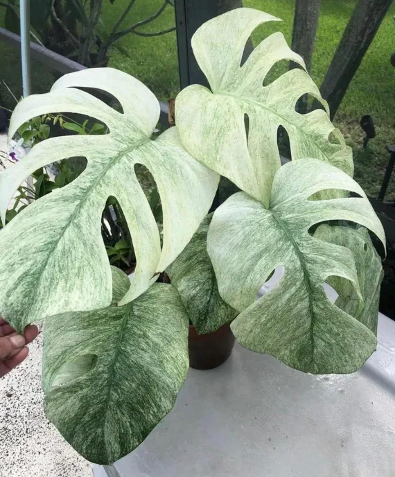 Monstera deliciosa ‘Mint Variegata’, often called the Mint Monstera.It is prized for its delicate mint-green and white marbled variegation that appears frosted or misted